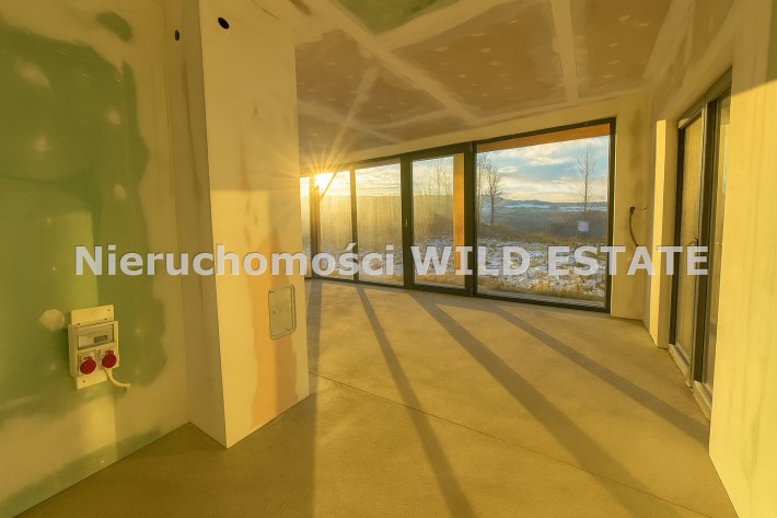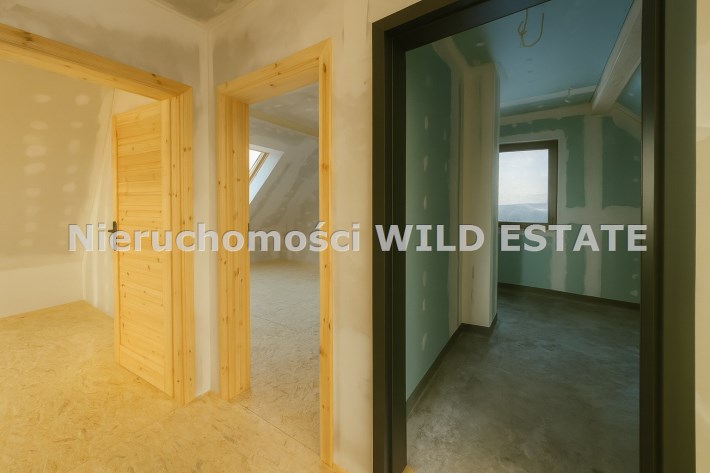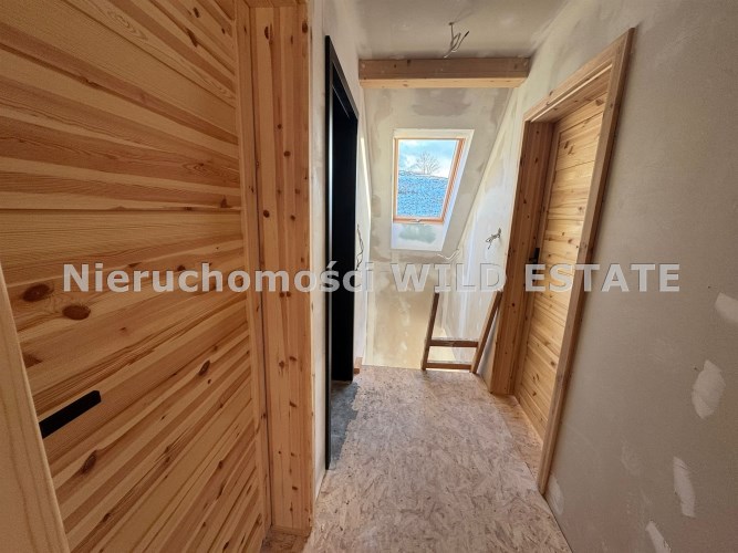 Budynek jest w stanie surowym zamkniętym. Wybudowany w technologii szkieletowej, drewnianej. Konstrukcja wypełniona wełną mineralną oraz styropianem; na wszystkich ścianach zewnętrznych znajduje się folia wysokoparoprzepuszczalna, elewacja wykonana z tynku cienkowarstwowego, z elementami sztukaterii drewnianej. Stan wykończenia stanowią okna plastikowe 2 szybowe i drzwi wejściowe w kolorze antracyt. Pokrycie dachowe wykonane z blachodachówki. Ściany wewnętrzne wykończone płytami kartonowo-gipsowymi, wyciszone za pomocą wełny mineralnej. Duże przeszklenia na parterze pozwalają na wyjście z salonu na taras. Dwie sypialnie na poddaszu posiadają wyjście na zadaszony balkon.