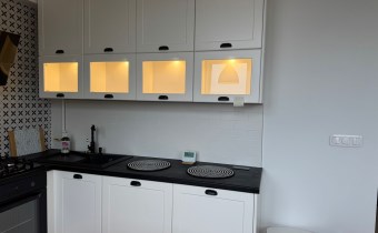 - Salon z aneksem kuchennym: lodówka, płyta gazowa, piekarnik, okap, meble na wymiar, stół z krzesłami, kanapa, fotel, szafka;
